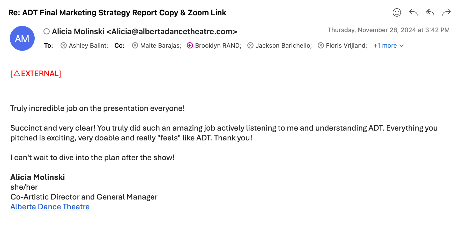 To effectively communicate our strategy, we created a professional pitch deck tailored for Alberta Dance Theatre’s leadership team. The presentation highlighted key insights from our marketing report, including the situation and SWOT analyses, marketing goals, and the proposed 4Ps strategy. We emphasized actionable recommendations and visualized our implementation plan to ensure clarity and impact. The goal of the pitch was to present a clear, compelling roadmap that the organization could confidently adopt and execute moving forward.