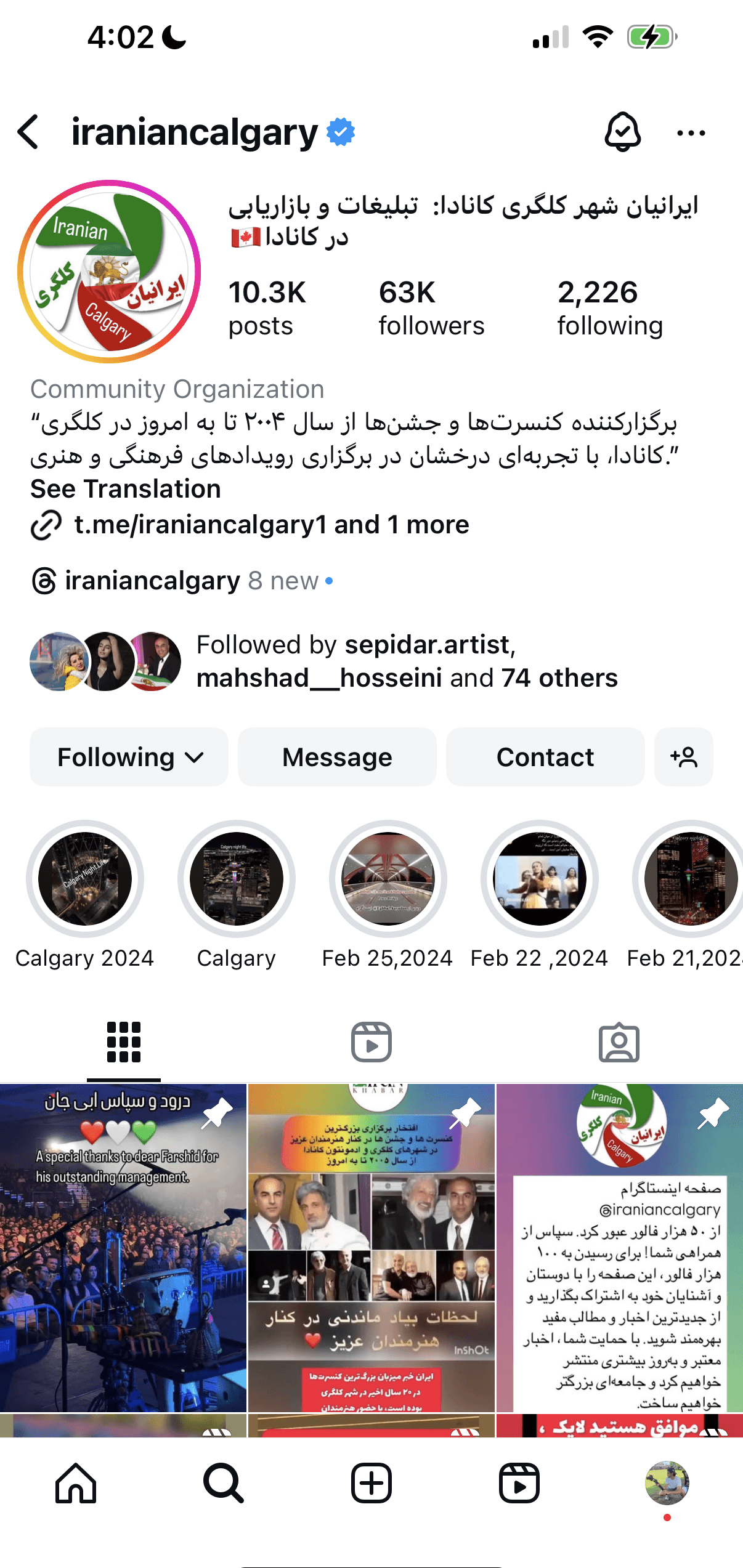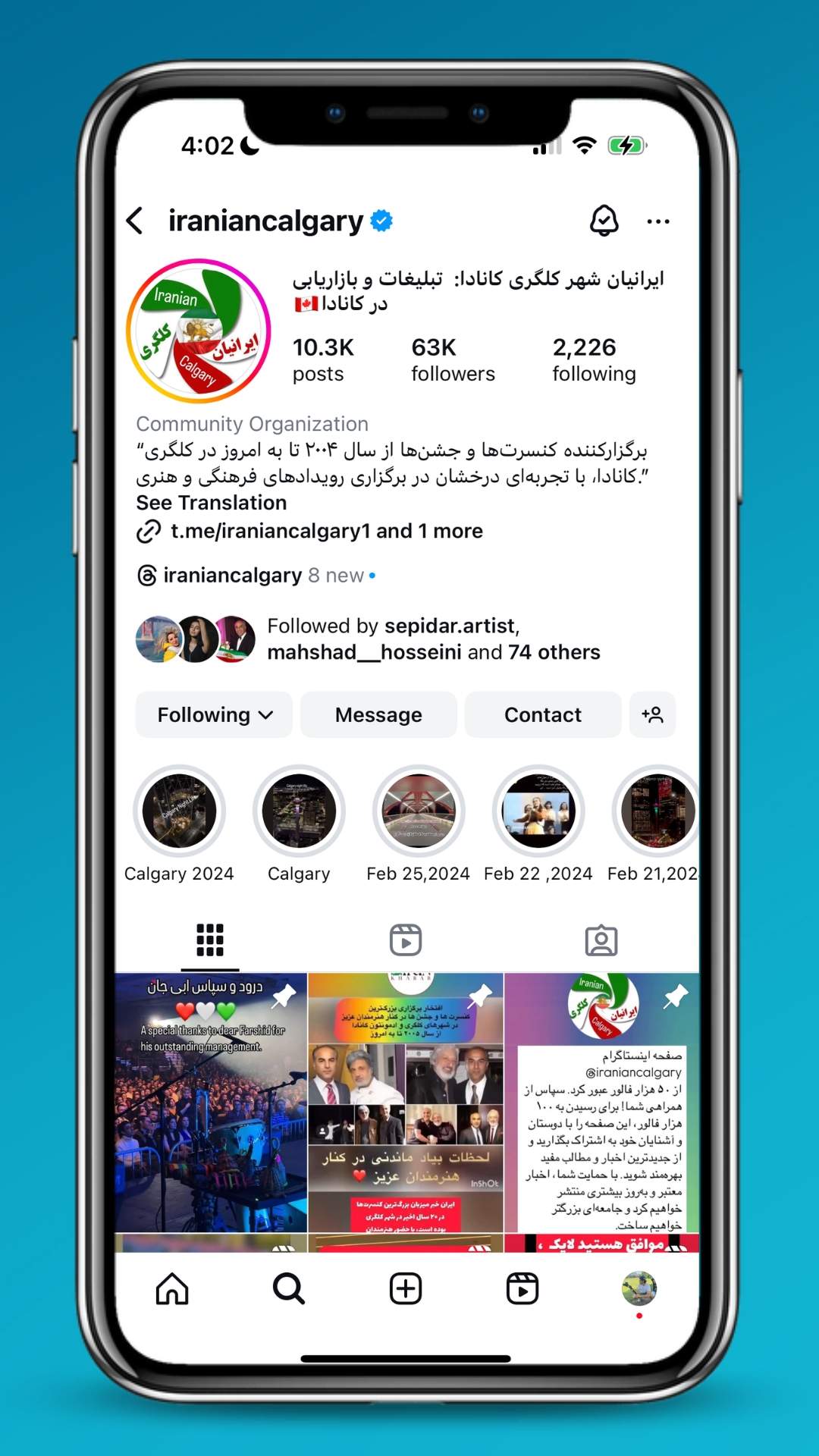 When I partnered with Iran Khabar in 2025, the organization’s Instagram page was already one of the largest Iranian platforms in Calgary, with a following of over 20,000. Recognizing the growing influence of digital media in cultural promotion and event marketing, I was brought on to revamp their social media strategy—specifically focusing on Instagram. My primary goal was to enhance engagement, elevate content quality, and expand the page’s reach beyond the local community to audiences across Canada. By aligning our visual identity with audience interests and strategically promoting concerts and media events, we aimed to grow our national presence and foster deeper connections with clients and followers.